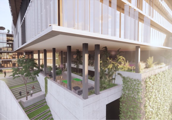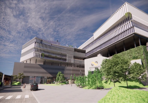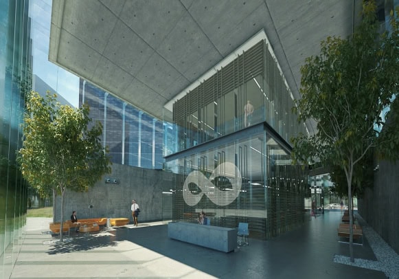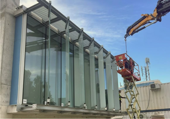 Our role: complete design of a custom solution for a system of sunscreen exterior louvers (up to 6m high) for the bank building.